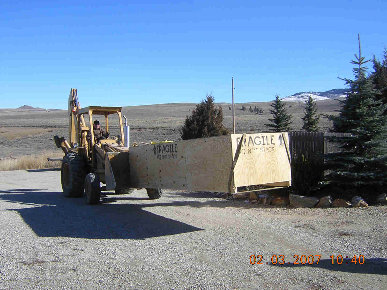 At my place, Mel plucked it off the trailer with straps and his back hoe bucket as shown in the attached photos. The guy is an artist with a backhoe--what more can I say. I couldn't recommend his method, but it worked for me. I had visions of a crumpled crate full of thousands of dollars worth of crumpled aluminum. I haven't calculated the compressive force on the 900 lbs crate, but it had to be a lot. He just drove the crate into the garage and set it down on two furniture dollies with 2x4x4's laid across to distribute the load.