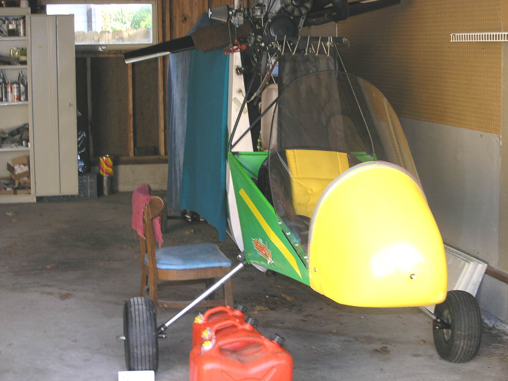 It's small and easy to maneuver with the single axle. It has negative tongue pressure, which means when I remove it from the ball hitch, the tongue goes up and it rests on the tailwheel. If you think it would be unstable on the road, it's not. This is because the slipstream acts like a huge rudder going down the road and actually stabilizes it. I've trailered though some heavy winds with this. The faster you go, the more stable it becomes. In a good wind I can feel the back of the car moving a little. I only go about 7 miles to the strip, so it's not too bad. I wouldn't want to trailer it for long distances, but I'll bet I could. Here it is in my garage. I haven't ever had any problems with this, but I have to make sure the trailer wheels are chocked and the tongue prop is secure before unloading. If it moves, the wings can get dented easily. I have to be very careful.