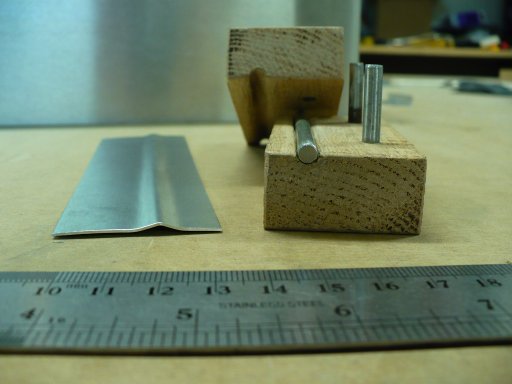 Yesterday evening I made the simple bead block press to create the bead on the fuel tanks. The result is pretty good, but it requires a lot of pressure with my vice on the .032 Al, also you have to do it in steps to keep the bead nice and smooth. If I want to continue this I will also have to make a smaller block that allows me to follow the curves of the fuel tank. The attached images show the the little oak bead press block that I made and two images of results on a bending test strip that I worked on to test the location for the fuel tank bending. I'll continue working on this an report my results.