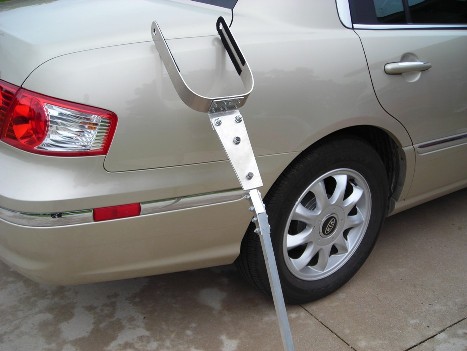 Attached are two pictures of the tow bar I made for my Zodiac601XL. The axel on the tri-gear sticks out on both sides of the wheel pants and the tow bar fits onto these two axel ends by spring action. The part that fits onto the axel ends must be at least 1/8th inch thick and of spring aluminum. The black strips you see on the inside are the soft side of velcro to protect the paint on the wheel pants. I do not need a tow bar to pull the aircraft out of the hanger but I do need it to move the aircraft backwards into the hanger and this one works very well. I will furnish more detailed information as to dementions, where to get parts, etc for anyone who is interested.