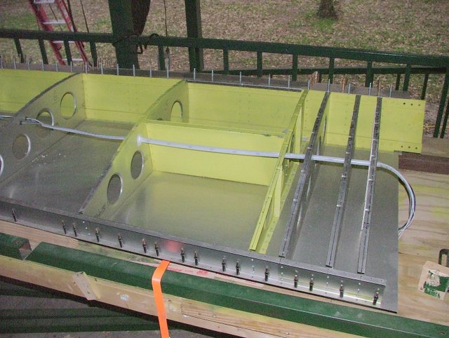 Dave what I did was to suspend my conduit in the first set of lightening holes aft of the spar. I made hangers out of 6061-T6 .016" and drilled them out with a Unibit to accept the correct grommet for the OD of my conduit. The hangers are rivetted to each rib along the way. I used thinwall aluminum tubing fron AS for the conduit. The connectors at the wingroot will enter the fuselage under the front seat support where the spar bolt access plate lets me get to them. I think the photo is small enough not upset anyone.