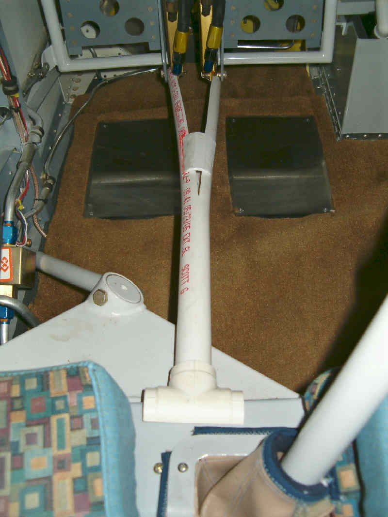 I've made a rudder lock for my RV-6A after seeing a concept at Sun N Fun a year ago. So, I don't take credit for the idea. I found a simple and cheap way to make one out of PVC pipe and one "T" fitting. I was planning to give more detail for anyone who might think it useful. Then, I read your post. I've been using my seat belt on the stick for elevator and ailerons. I don't have the rudder lock here to quote the dimensions, but you can get an idea of the concept from the photos. I'll post the rest of the info when I get a chance. You can see that it is very simple and cheap. It merely requires a piece of PVC pipe, a "T" and a union cut to hold the splayed halves of the pipe and come PVC Cement.