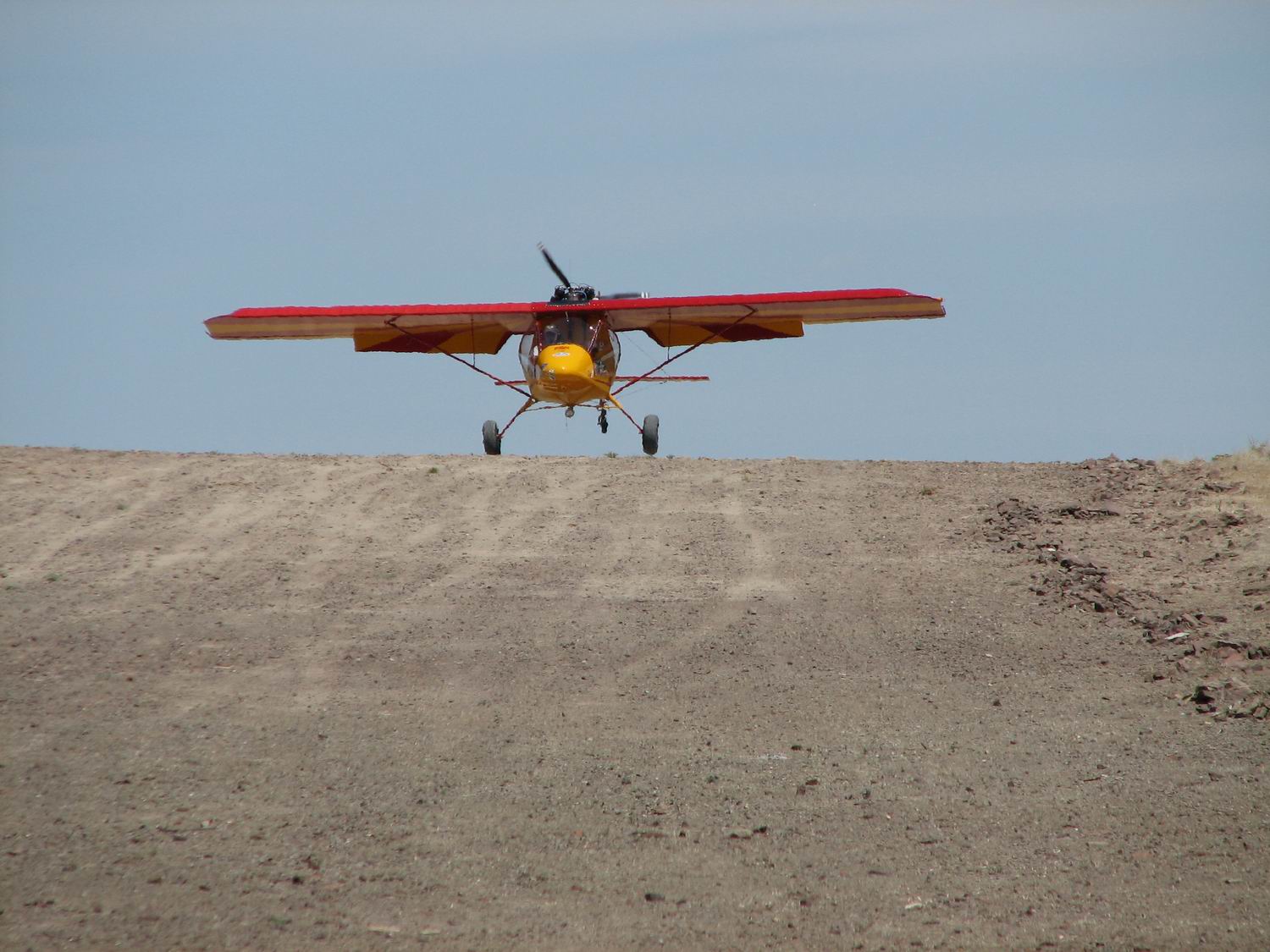 On the third pull the mighty 447 roared to life, I strapped on the plane and ran my checks... When I was ready to launch, I yanked the line to activate the catapult... nothing (#(at)$%*$#&*&#%). Second yank, the pin slipped the loop and we trundled downhill. As we passed between two avocado trees I pour on the fuel, pull the stick back to the stops and on the second bounce we leapt into the sky. Shortest fixed wing take off for me, ever. (100 Ft.)