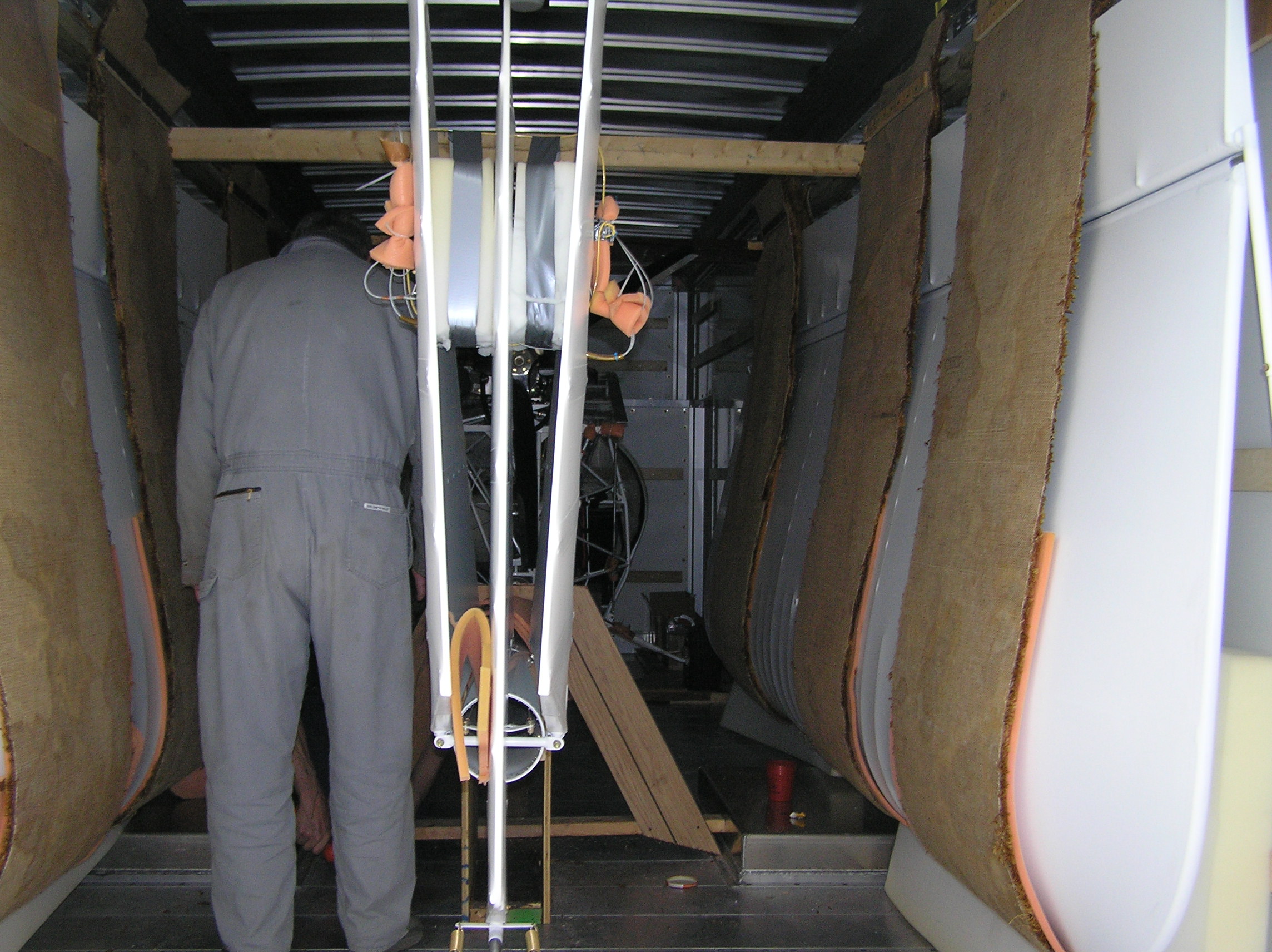 For some reason I could only get one image to attach. So here is another one. Wings were hung with foam, carpet and 1" nylon safety straps. Wheels chocked and boom put on a rest.