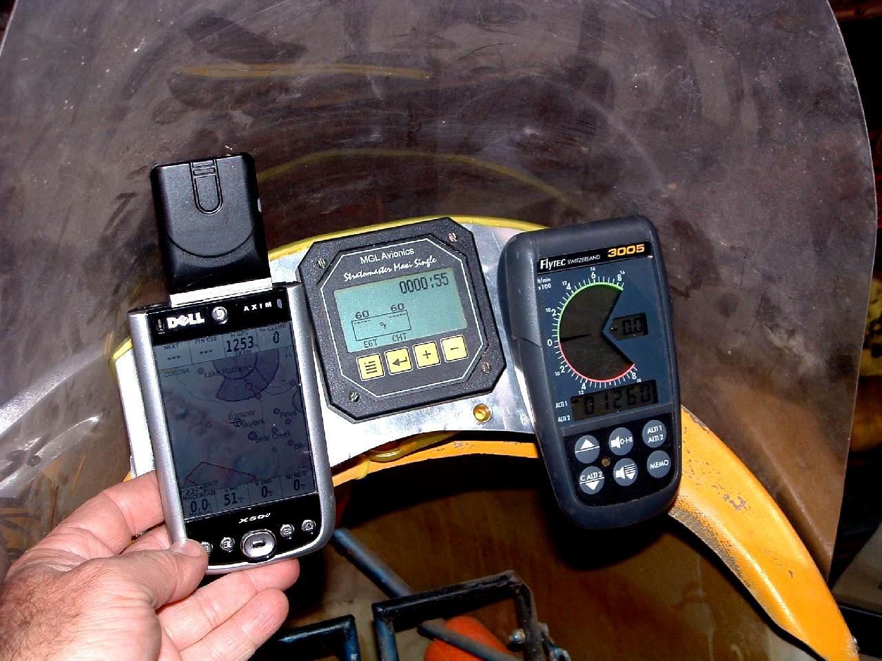 On the right I have a Flytec 3005 Dual Altimeter and Variometer(Rate of climb) with audio, powered by internal AA bateries. ($225 on ebay)