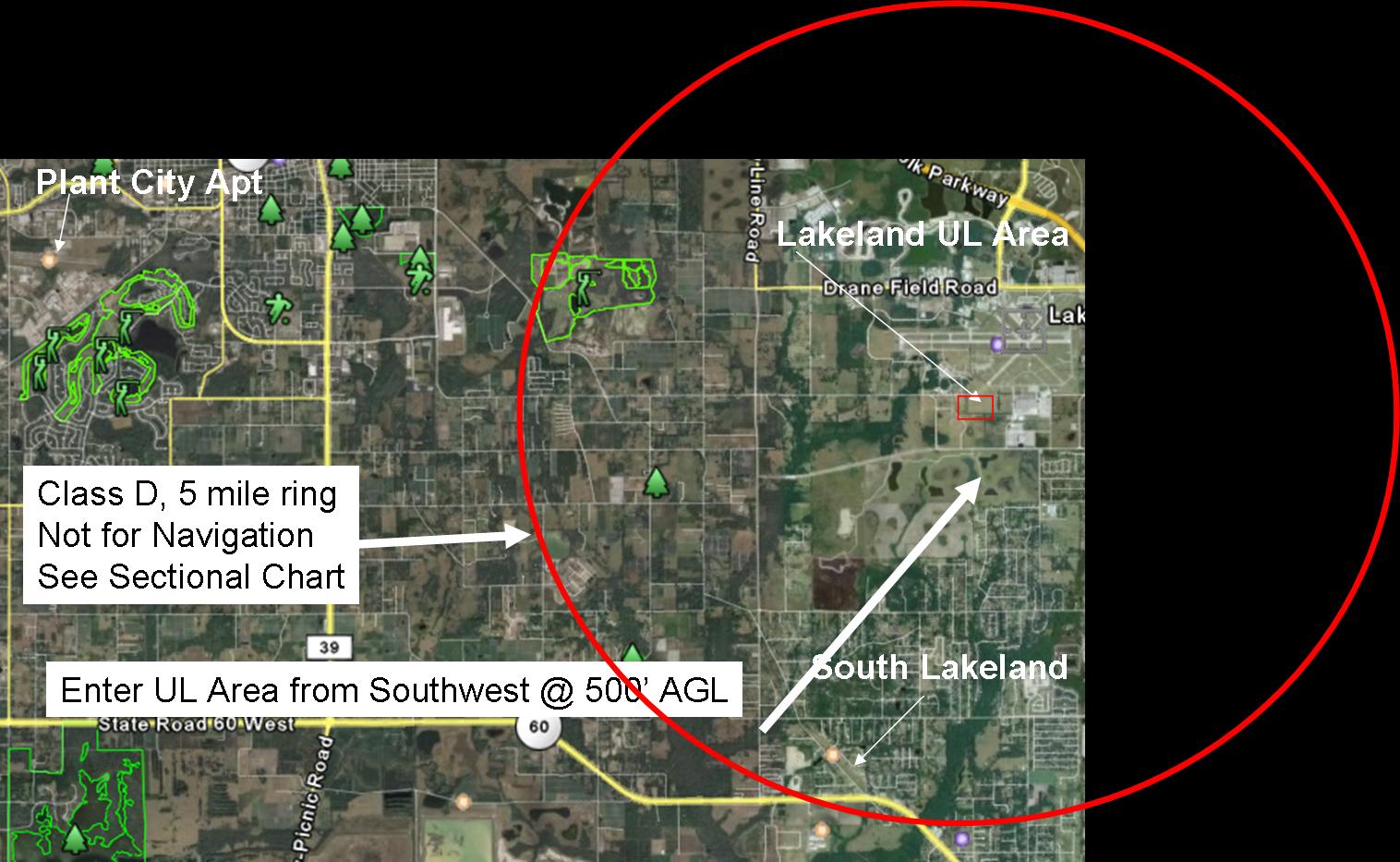 The arrival procedures for the UL leave a lot to be desired. I have attached three pictures (I put these together several years ago for some first time UL folks to SNF). I prefer to go south past LAL on the west side. All the GA folks are lining up on the northeast side. You can use South Lakeland as a guild. You need to be inbound in a north easterly direction (from the southwest). Do NOT go north of the UL area or over/east of the buildings on the east side of the UL area (you're getting into helo country). I hope the pictures help.