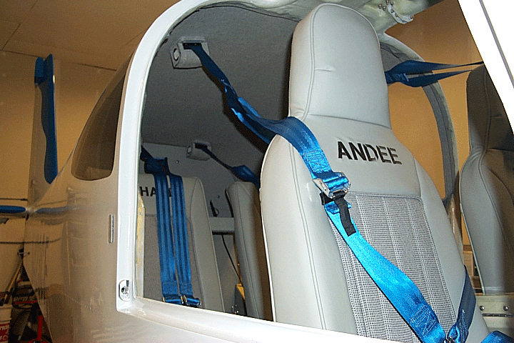 Hard to say since I am not flying yet, but it does not seem to interfere with entry or exit and does not clutter the forward view for me in the rear seat; Those sanitary cloaks on the sticks are to keep the fiberglass dust at bay. Rene is flying with the belts; and John Miller aka Gengrumpy is flying with them.