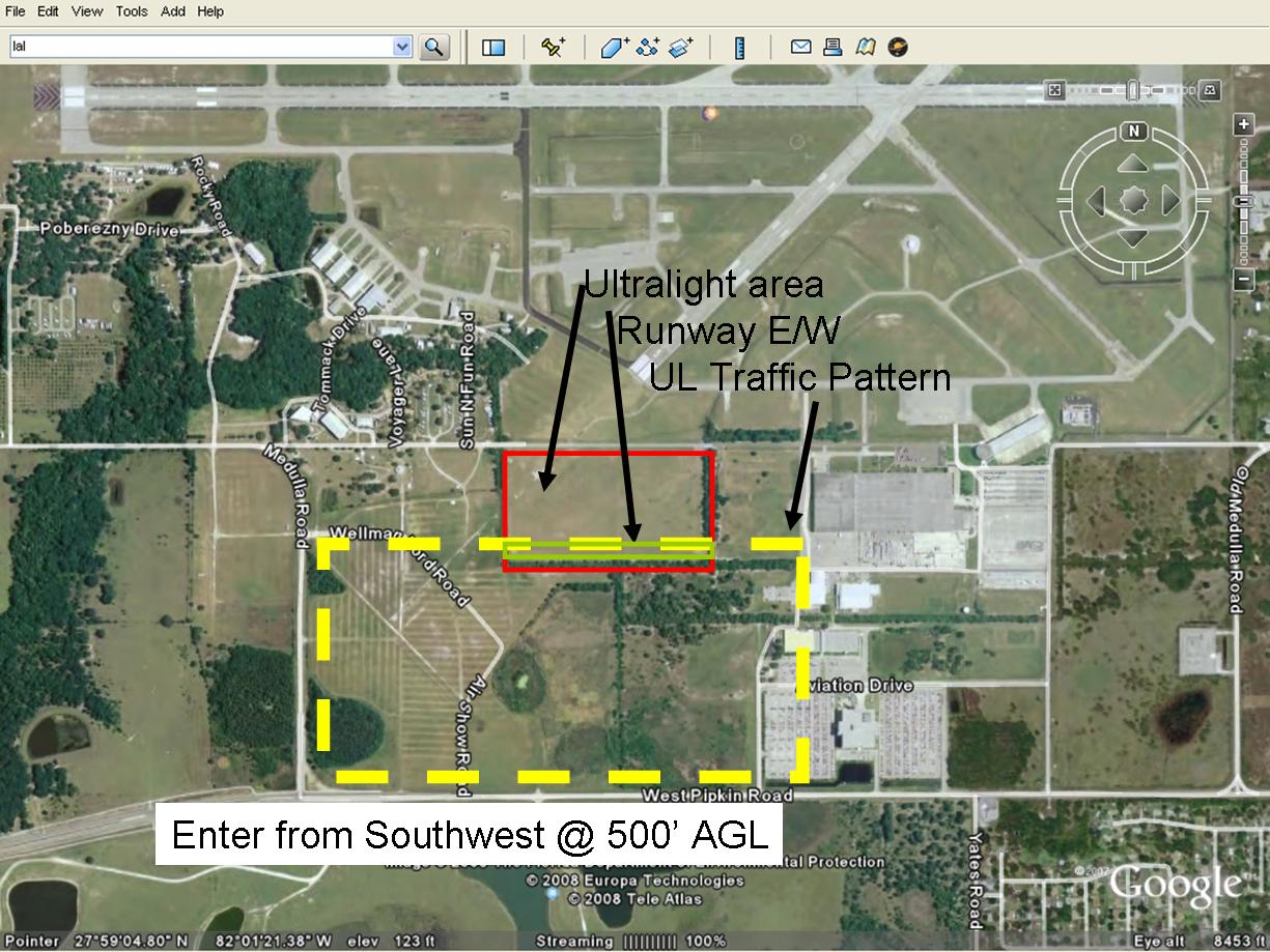 The arrival procedures for the UL leave a lot to be desired. I have attached three pictures (I put these together several years ago for some first time UL folks to SNF). I prefer to go south past LAL on the west side. All the GA folks are lining up on the northeast side. You can use South Lakeland as a guild. You need to be inbound in a north easterly direction (from the southwest). Do NOT go north of the UL area or over/east of the buildings on the east side of the UL area (you're getting into helo country). I hope the pictures help.