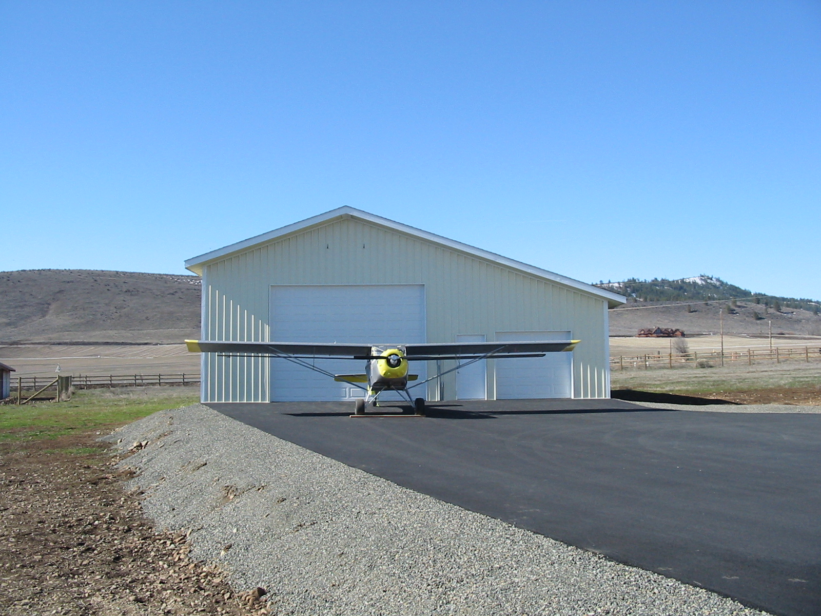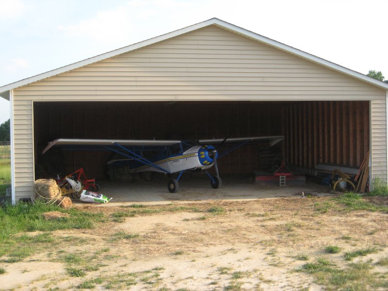 Here's mine. My plane has to share the building with various tractor implements and a few hay bales. It's just a regular garage style building with an open face. A went to a local builder that specialized in garage buildings and he built this to spec for $10k. That included a bit of grading and gutters. Now I need to figure out a door to keep the ducks out Smile.