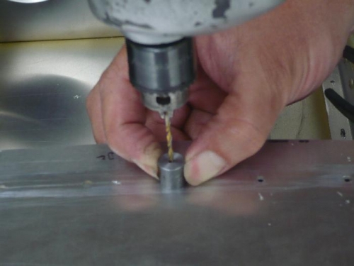 Later I drilled out the skip (every other) rivets and had to place and clamp the dzus strips and get the pilot holes right in the center of the large hole. I made a bushing and used it to locate the pilot drill right in the center.