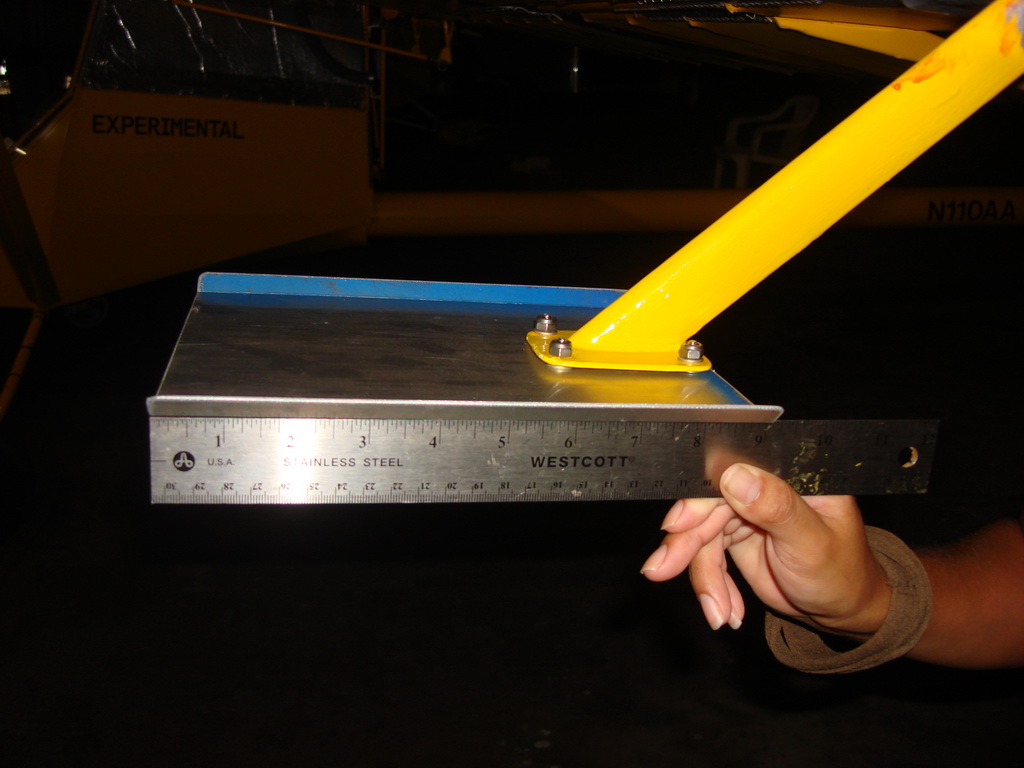 Attached are some more pictures, that show the size of the spades, and the 1/2 inch of the edge that is bent up at 45 degrees. The 45 degree bent edges reduce flexing under load, the spades should not flex at all in flight, I used 6061 T6 aluminum which is very stiff. I used washers to get the spades exactly level with the bottom of the aileron, within 1/3 of a degree, again this is important so that they do not act like trim tabs. The size can been seen from the ruler in the pictures.