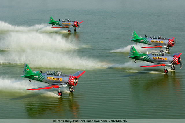 The pics which should have accompanied it showed 4 T6`s apparently landing on water with each one trailing a wake. The second shot taken from water level showed that there were no floats but each T6 was just touching the surface of the water with its wheels. All part of a South African display teams show which has just been cleared as `safe` by the authorities. That reall is accurate flying.