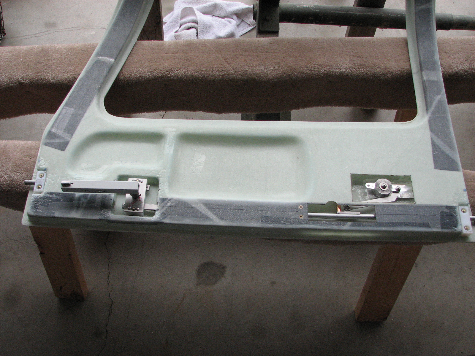 The fiberglass recess was slotted to allow the door lock arm to swing up and out of the way. It's hard to see the cut in the picture.