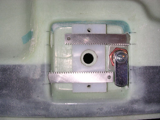 The drawing that others show in later posts show the lockset out side of the fiberglass recess C but in that case the lock arm would need a 90 degree bend at the end of it to be able to hit the back end of the geared pin arm. The lock set in this case would only be able to rotate about 30 degrees to get out of the way of the geared pin arm C any further rotation would make it hang up on the fiberglass recess walls.