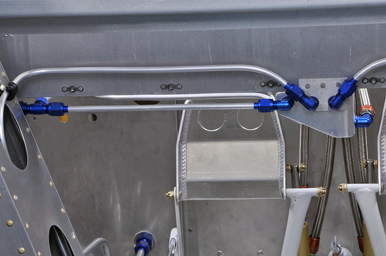After some thought C I came up with the following system for the low pressure feed. I used standard AN 1/4" fittings and aluminum tubing to bring the fluid from the reservoir to a tee fitting and then to bulkhead fittings that connect to standard Aeroquip hoses to the master calendars. Yeah C it was a little more weight C but the peace of mind is worth it.
