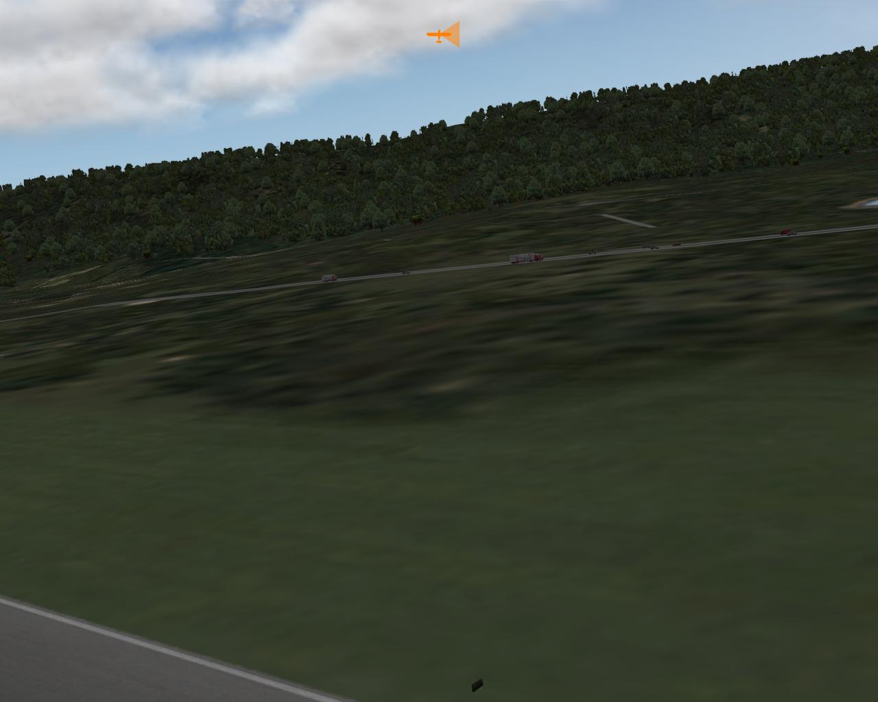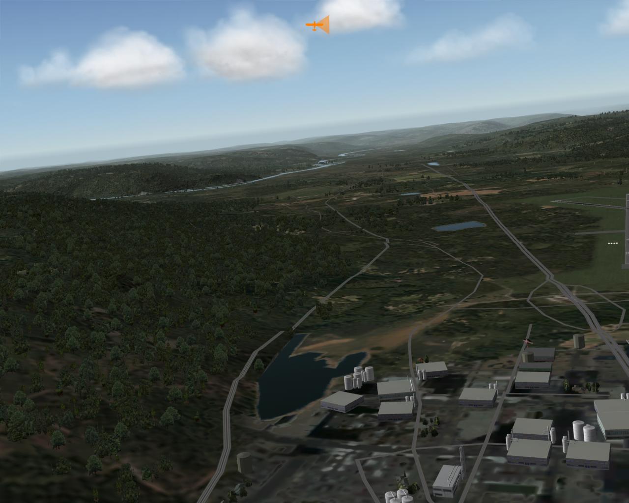 Edit: here are some pictures I took of our local area. Elmira, NY specifically. The buildings are generic, but it uses a real road map database, so all the roads and railroads you see are real. Notice the numbers of trees, this adds a lot of realism over just flat terrain in my opinion. Also notice the cloud shadows over th hills, really nice effect.