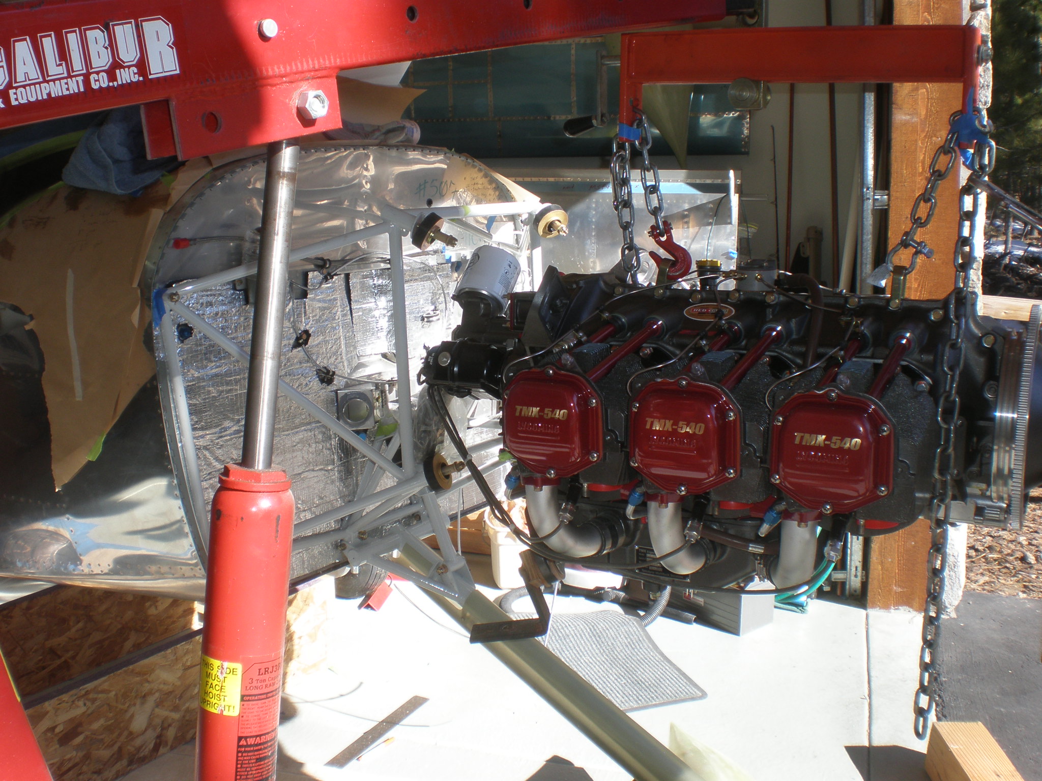 I used the typical engine hoist borrowed from EAA Chapter 1073 (thank you verrrry much). But I also used the balance beam that was at the chapter along with the hoist. This enabled us to shoehorn the engine into the "ears" Verrry easily. We married the upper ears to the airframe first and then rolled the balance beam to drop the front of the engine and the lower ears just joined up with no effort at all. Try to get the pic attached