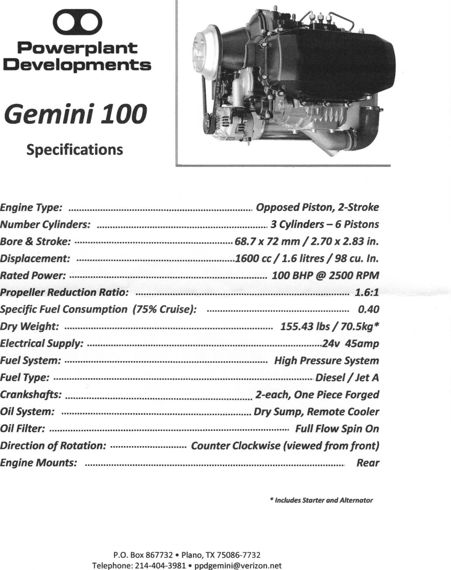 There wasn't much new stuff at Sebring last week but there was a engine on display that looks promising, a Gemini 100. They claim that a production engine will be sold as an option on a factory built LSA by March of this year. The engine is priced to be completive with a Rotax 912ULS and weighs about 18 pounds more. Rated at 100 HP at 4000 RPM for the engine with 2500 Prop RPM. Its kind of a radical engine with two crank shafts, water cooled, two stroke, 6 pistons in three cylinders, burning diesel or Jet A. They are talking about a initial 2000 Hr. TBO then going to 3000 Hrs. I don't see a web site for them. Attached is a scan of their flyer.