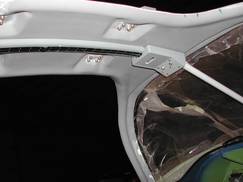 On a budget?? Here is my """"Overhead Console"""". One ea blue and white LED strips switched at the box in the picture and dimmed at the panel. The led strips are mounted to an epoxy coated balsa cover that hides the RG400 to the GPS antenna. The switch box covers the brace mount screws. In the final configuration the switch box has a cover plate (over the slot) with a High intensity 'DOT' type LED (battery - independent of everything) with a diffused lens.
