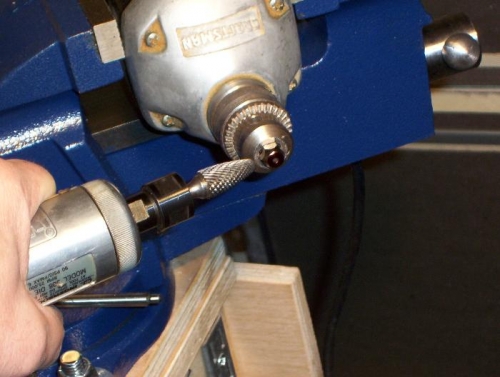 | 3/8 drill motor held in vice. Die grinder with acorn shaped carbide burr. |