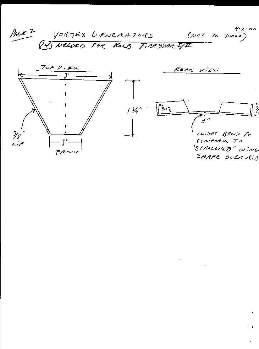I attatched the first set at 11 inches back from the leading edge. These were on the full ribs. I then attatched the second set on the false ribs and I set those with the back of the VG's even with the front of the previous set. I have included the information that I received to make mine. I attatched them with double sided servo tape from a hobby store. It does well. If for some reason they don't come through let me know and I will send them to your email. If you use lexan (1/16 ) You can bend the lexan just as easy as alum, but being clear it is not necessary to paint them. The color shows right through making them almost invisible.