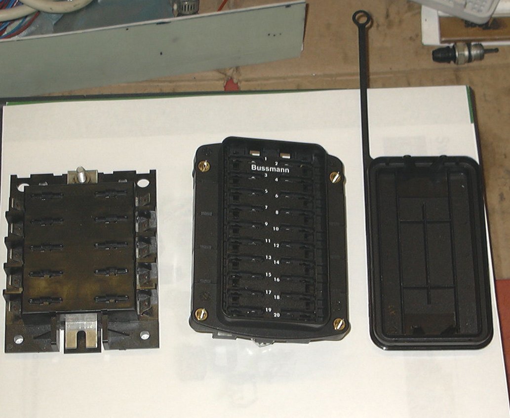 Check out this new fuse block from Bussman. It is physically the same size as the older 10 fuse units, but holds 20 fuses. It mounts from the rear with 4 #8 screws. All the wiring exits the rear as well. It comes with a nice cover and it is of a "split bus" design, so you can use one block for both main and essential buses. See attached photos for comparison. I bought mine from MIH. He gives you the block, an assortment of connectors and the connector removal tool. Great guy to deal with.