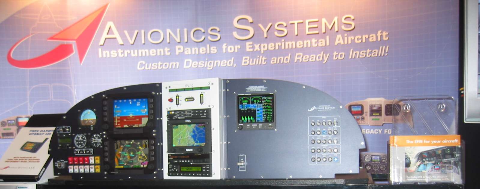 No new RV-10s to take pictures of but I have attached a picture of a new modular panel. This one is all aluminum, has removable sections and choice of either a slightly canted or straight radio stack. Picture is of a completed example from Avionics Systems' booth but the panel is also available from Stein either finished or unfinished. This attaches to the same mount holes as the stock panel and eliminates the cross bar so effectively get a couple more inches vertical height for instruments, EFIS and/or radio stack.