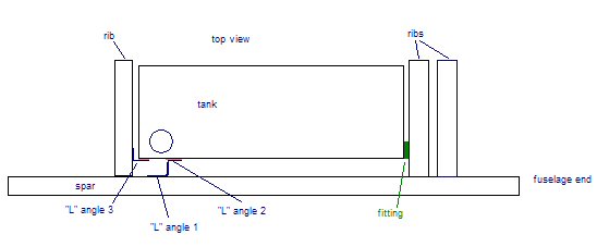 The schematics I have show the leading edge tank in place between ribs, and, on the far end (from the fuse), supported on the side by one l-angle attached to the adjacent rib, and by two l-angles forming a "Z", attached to the spar (see attached diagram).