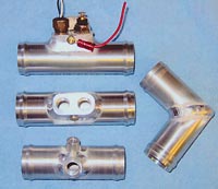 Kube made a fitting out of 1-inch aluminum tubing with a rolled bead on each end and welded on a threaded port to accept the temperature sender. The fitting, in combination with two hose clamps, worked out so well he has decided to manufacture several more for builders having the same problem.