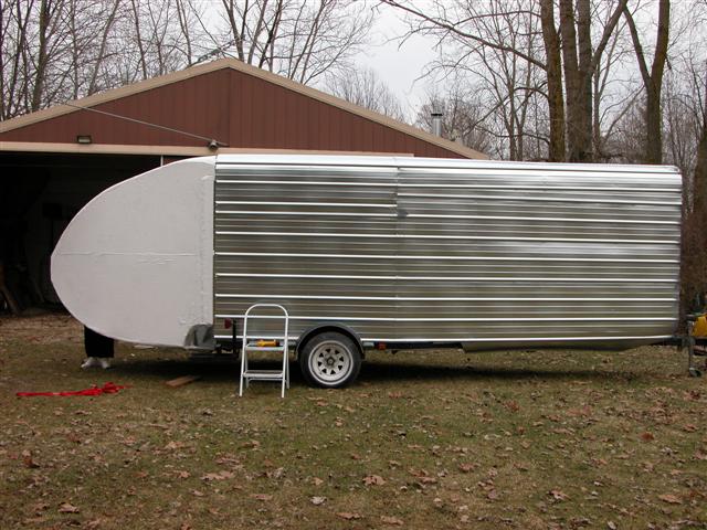 I just did my first test fitting of my clam shell doors on my Kolb trailer. The trailer weighs about 1000 Lbs. empty and will hopefully be able to be pulled by my Toyota Sienna. The clam shell doors are made of foam board then fiber glassed. The frame was a boat trailer that I added a tube framework to and covered with pole barn steel. I wanted to have it ready to pull it to Florida this year but it just isn't going to happen.