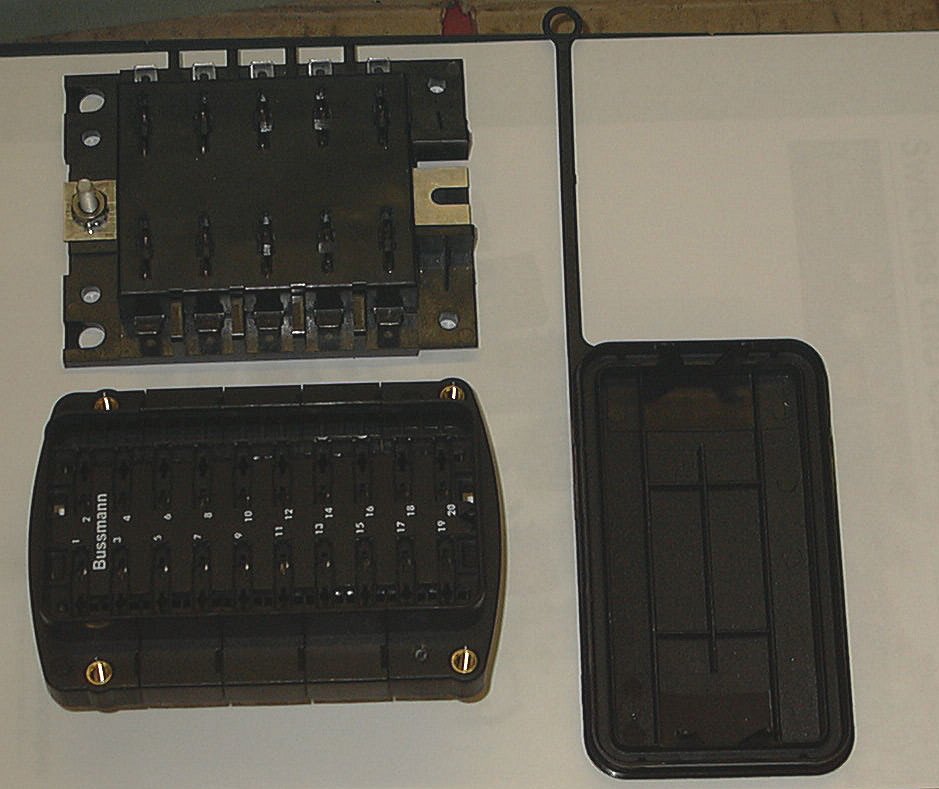 Check out this new fuse block from Bussman. It is physically the same size as the older 10 fuse units, but holds 20 fuses. It mounts from the rear with 4 #8 screws. All the wiring exits the rear as well. It comes with a nice cover and it is of a "split bus" design, so you can use one block for both main and essential buses. See attached photos for comparison. I bought mine from MIH. He gives you the block, an assortment of connectors and the connector removal tool. Great guy to deal with.