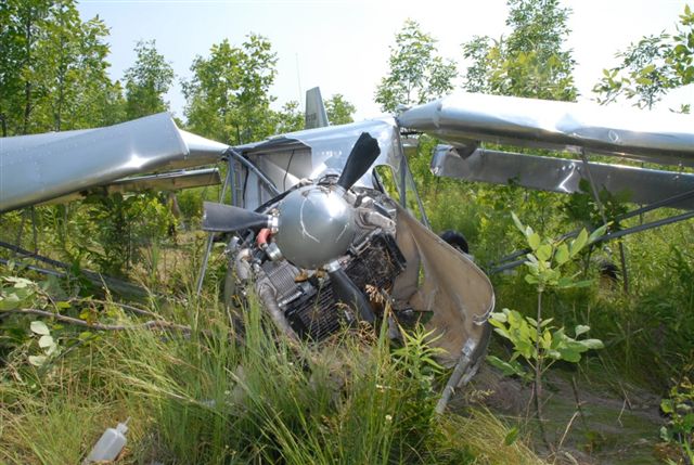 Hi Folks, just an update, below is a picture of Jon’s plane. I’m sure by now most of you have gone to visit the previous links and have viewed the offending tree that he got caught on. Jon is an excellent pilot with many 100’s of hours of flight experience and as you may have seen from another previous link he knows the 701 well and can sit it on a strip even better then I can. However, Jon does have a streak of ill fortune in his life it would seem. His first accident was due to an engine modification in which he shared with this list admitting his mistake and in fact making 3 other people who did similar modifications aware of the possible dangers. From time to time Jon has also cautioned new builders of this carb modification to the Rotax whenever it came up on this list.
