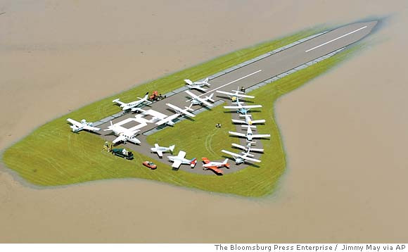 Finally at 8:30 AM, after an hour and a half delay, I pushed my plane through 8 inches of water with about half of the 2800 foot runway under water. The engine actually fired, the EFIS worked, and I made the 15 minute flight through the scud at about 400 ft. ATR (above the river) following it to Danville. It sure looks different barreling down the runway toward a lake!