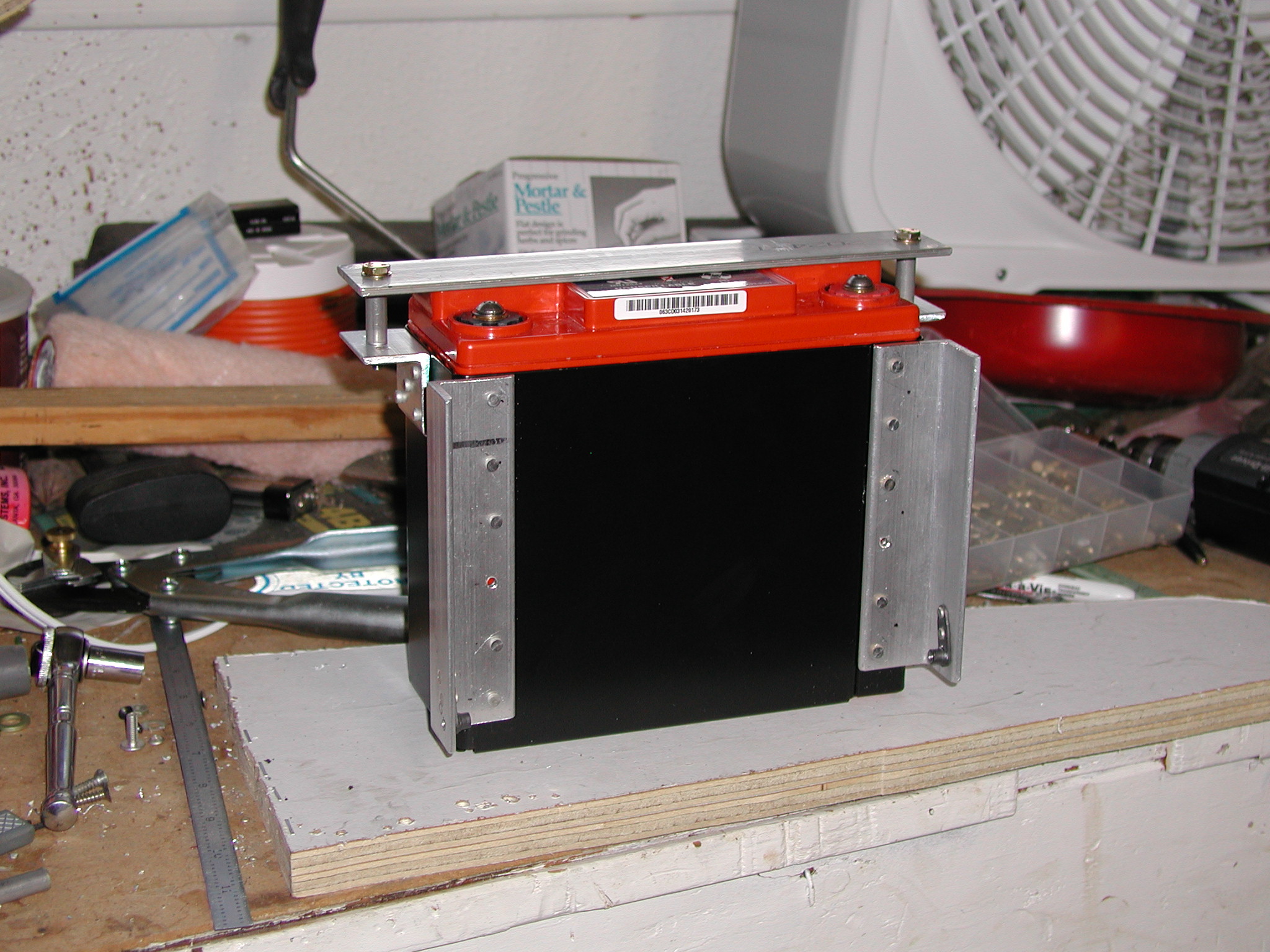 The way mine is set up there are two nutplates at the lower corners of the attachment angle that allow the battery box to 'hinge' aft for maintenance after loosening them one turn and removing the two top bolts from their attaching nutplates. The assembly is mounted just low enough to get the allen wrench in to remove the battery cable attachment screws.