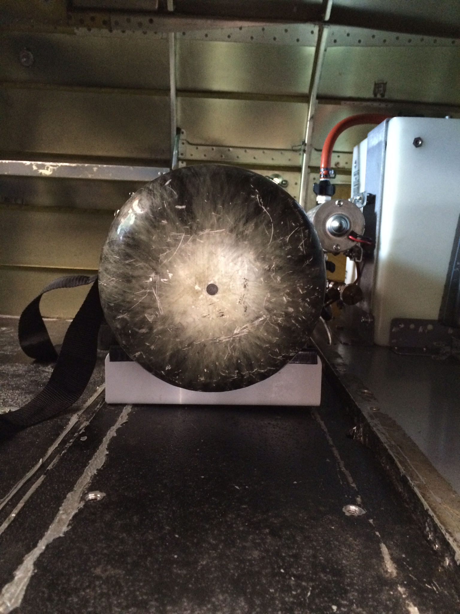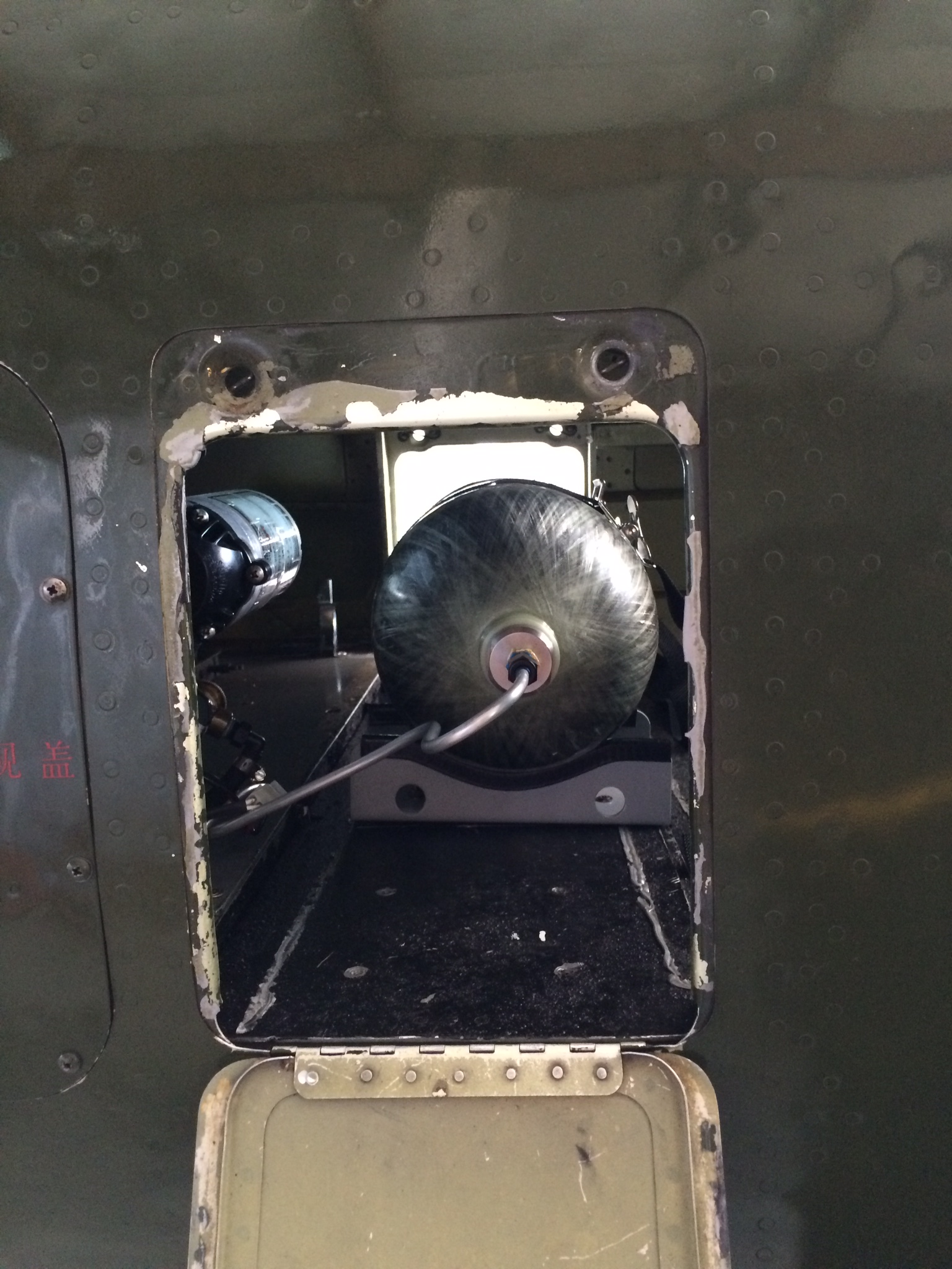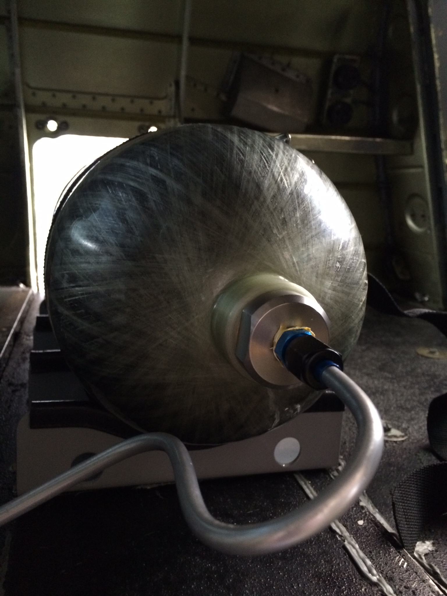 Here is the tank installed. Stock tank is still in airplane, since I'm testing and didn't feel like taking out smoke system and battery. Can still get items in through port side door. Tank can be removed in about 2 minutes. Filled up and ready to test. I turned up my pressure relief valve since there is no fear of overfilling system now. Nice to have the extra reserve air.
