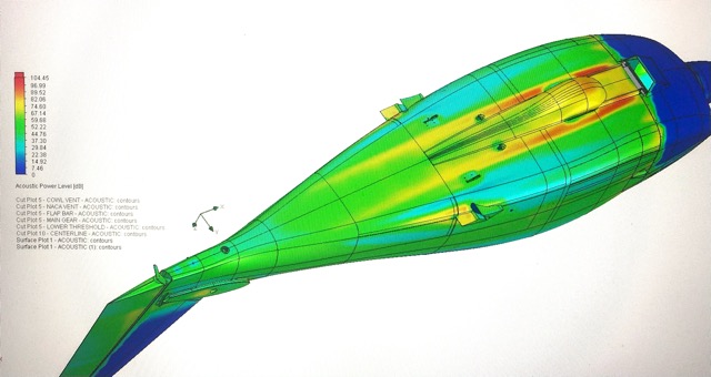 Regarding the main gear area... as the images show, with the gear retracted and set at its operational position, due to the existing lower cowl faring, it remains just on the cusp of free-stream air during flight; however, about 80db of noise is being displayed downstream; whether this is caused by the wheel or the cowl faring is not yet determined... some updated images attached; the first Velocity, the next two Acoustic Noise.