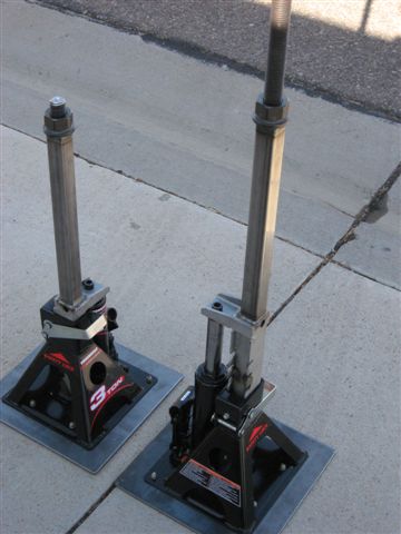 picture of the jacks for the RV10. Note that although they think of the jackpads of having a .5" diameter it is actually .7". we will need to enlarge the cup in the end of the threaded rod. a 12" threaded rod allows these jacks to range from 27" low to 42" high. lift from starting position is 8+". Note that they have a mechanical lock to protect against hydraulic failure. do not archive.