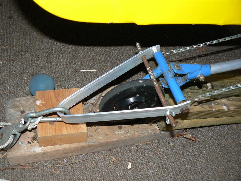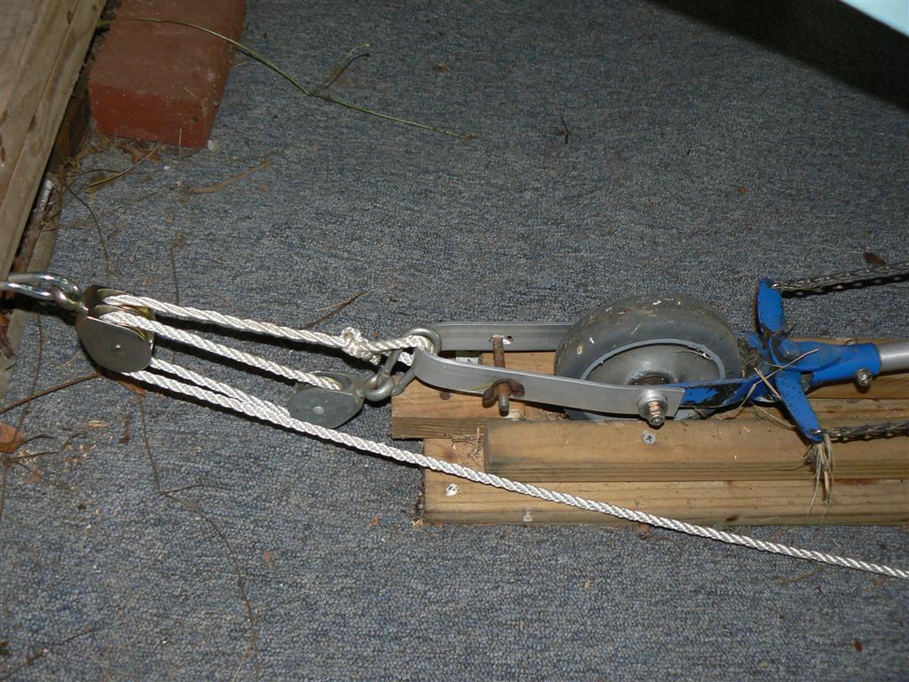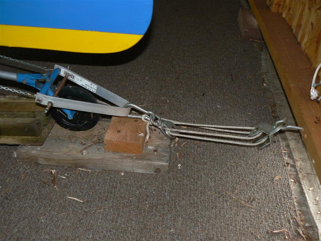 Hi Pat, here is our attempt at a pulley system. This allows me to pull the MKIII up a slight incline that is barely possible unassisted. Ed uses a similar system on his FSII, and since his airplane is a bit lighter, his pull is easier.