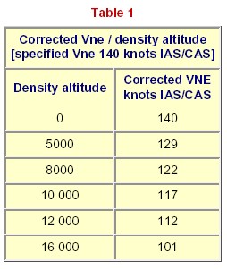 Table 1 is a normal calculation of corrected Vne, you can see that the difference between the 140 knots specified and the corrected Vne is significant and that it appears quite possible for turbocharged low drag aircraft to exceed corrected Vne in level flight at higher altitudes.