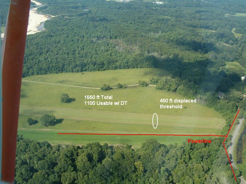 This field will be a challenge if you are used to landing on 2500 to 5000 foot runways all the time. It can be visually intimidating if you aren't used to it and up on your short field techniques. Start practicing if you are rusty on your short field techniques. We don't fly with passengers in the summer. Short-soft field and high density altitude (damn hot and humid) doesn't leave a lot of safety margin for two person operation.