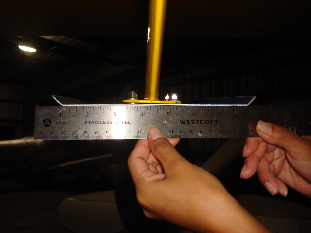 Attached are some more pictures, that show the size of the spades, and the 1/2 inch of the edge that is bent up at 45 degrees. The 45 degree bent edges reduce flexing under load, the spades should not flex at all in flight, I used 6061 T6 aluminum which is very stiff. I used washers to get the spades exactly level with the bottom of the aileron, within 1/3 of a degree, again this is important so that they do not act like trim tabs. The size can been seen from the ruler in the pictures.