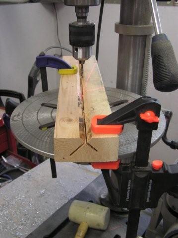 • First I made a V channel holder (see P1010015.JPG) as suggested by Carl. This I aligned on my drill press so that the drilled would always go through the centerline of a tube and clamped in place.