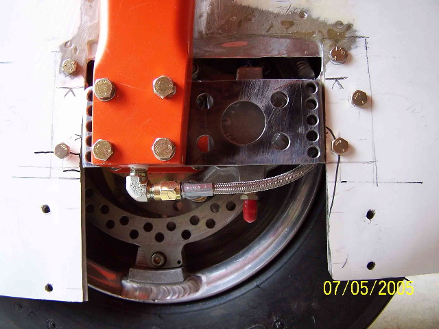 front-to-rear, and a slot in that to allow the brake line to exit.