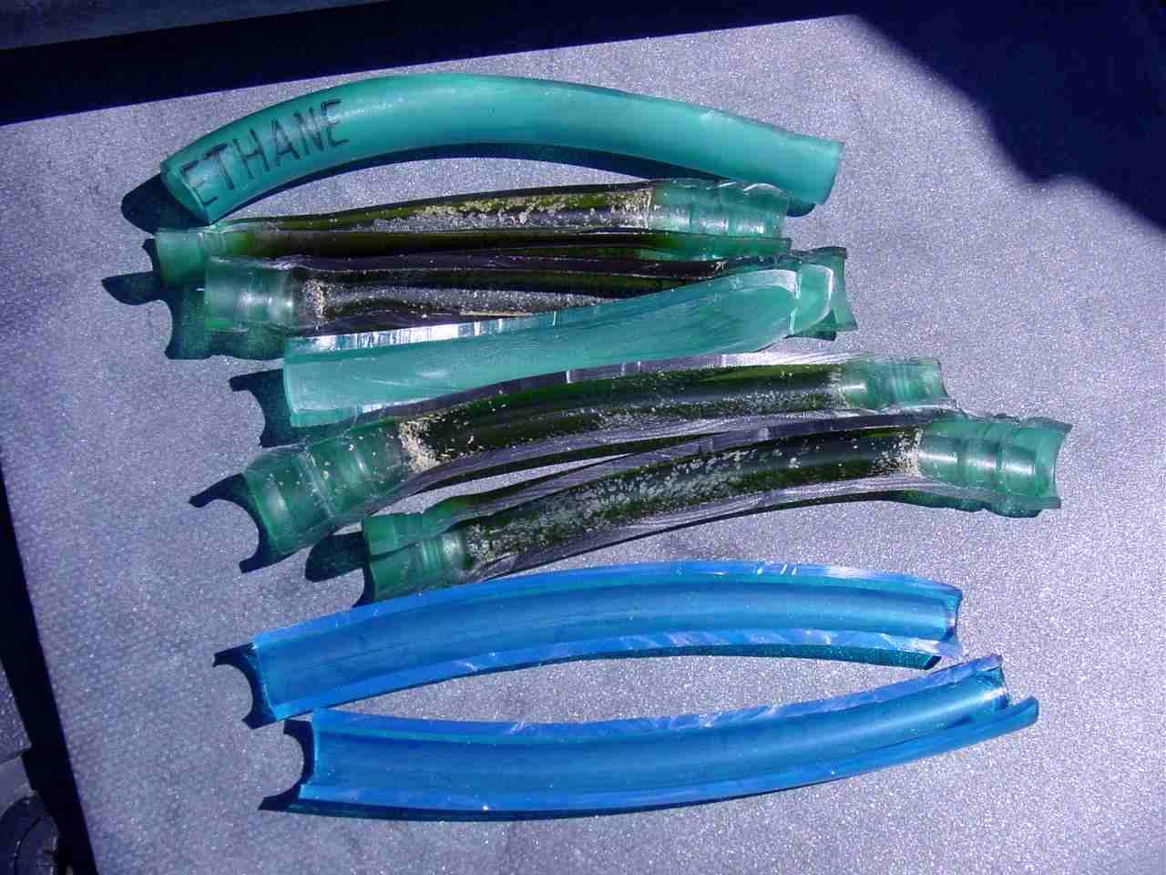 Had an interesting experience with the blue Bing down here... In service, it became the Brown Bing... and in some instances, the Black Bing with a brown furry side dish after about 5 months on the job. The puzzling aspect of the situation was that the clear Tygon fuel line pieces installed in the same system for the same period of time yellowed a little, but remained clean and unaffected inside. They were still soft and flexible. The attached photo shows the strange deterioration of the blue line, along with samples of the new blue stuff from the same batch of the corrupted Bing line and another batch of blue line obtained from another source.