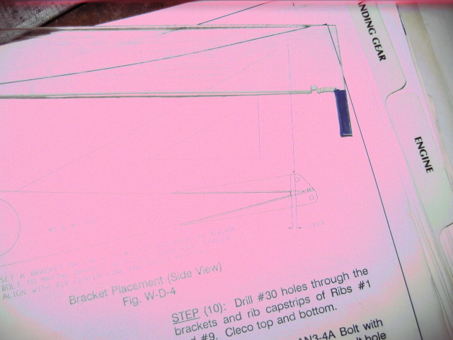 Hi all. Well things are moveing along on my project C not to far from being ready to cover. I am finishing up the last things on the wings and am now trying to temporairly mount the flaperon hanger brackets. In the manual it says to drill the holes before covering to keep the debris out of the finished wing. On page W-D-5 of the Sept 24 92 manual edition it shows a picture of how far back to mount the bracket. 0.194 from the trailing edge of the wing to the front of the upper bolt that holds the flaperon hinge to the brackets. I made a tool to gauge that dimention (see picture) and that forces the brackets up the wing to the point that they start to spread open. (see picture) If it is too tight now what will it be like after the layers of fabric and finishing tape are in place? How critical is that 0.194 dimention or will it make any real difference if the flaperon is somewhat farther back so that one isn't bending the brackets to get them to close up on the bottom of the rib? If you bend/distort them very much then the hole spaceing will change and the flaperon hinges wont fit. When I rivited the brackets togeather I used one of the hinges to space the holes the right distence apart as I drilled the rivet hole. Hopefully I was able to put my question on paper in a way that makes sence. Thanks Jim Chuk Kiffox 4 building Mn