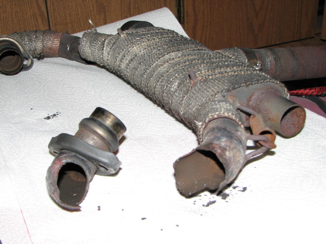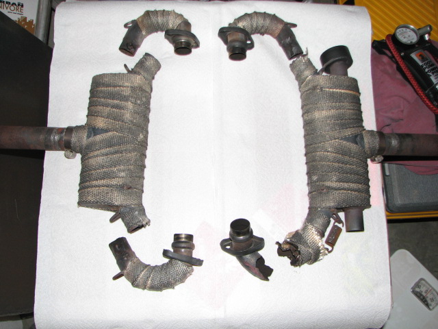The original left side muffler has recently failed in flight, breaking at the front elbow.