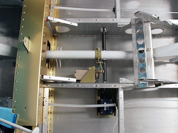Installation of the roll servo for the TruTrak autopilot was pretty straight forward. The system seems to work well and doesn't add any noticeable drag to the aileron stick forces. Fortunately, it just fit in with the Electric Aileron trim setup. I actually had to move the control horn on the stick column forward about 1/8" to assure that there wasn't any interference between the rod end bolt and the left spring. Seems two work fine and there is no binding or rubbing of any kind. Sweet.