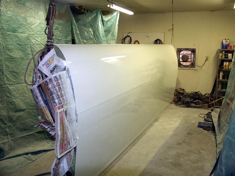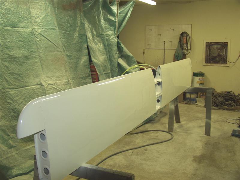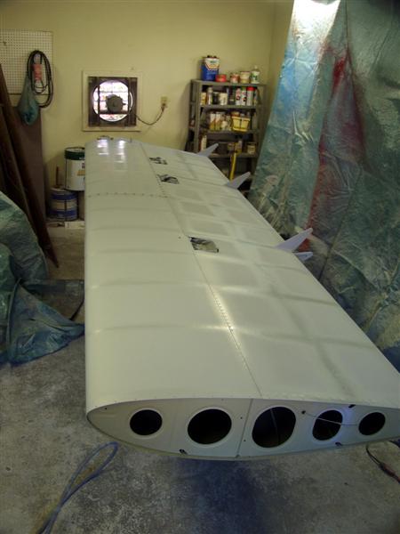 I'll include one shot of how I suspended the wing -- on the spar end, it's a small block and tackle, on the other it's left over pvc drain pipe on a hook in the ceiling. The wing has enough mass that it doesn't swing when spraying it.