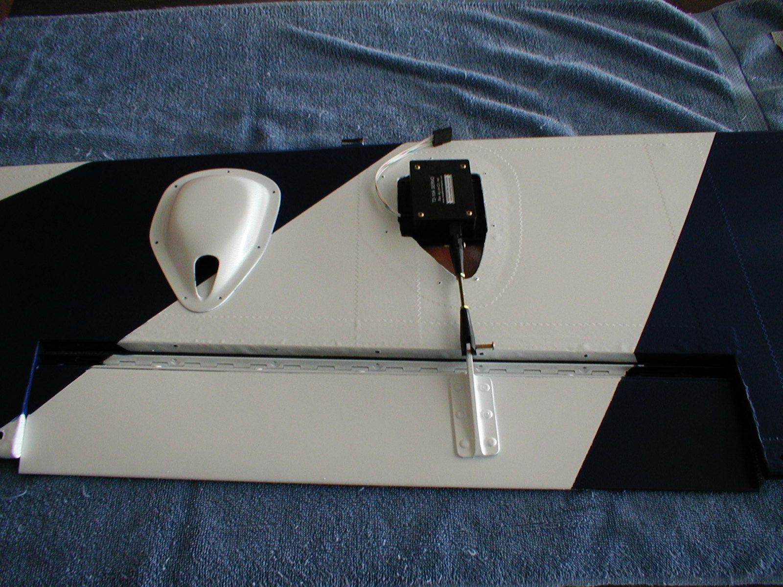 Paul, Lowell made that "nifty cover" for the trim servo. As mentioned earlier I have one of his first systems and have installed the trim button on the stick. It is similar to the T-28's I used to fly and sure makes it nice on approach. It was easy to string the wires. I used model airplane servo connectors to connect the wires which worked out well. Here is a picture of the elevator after painting prior to installation.