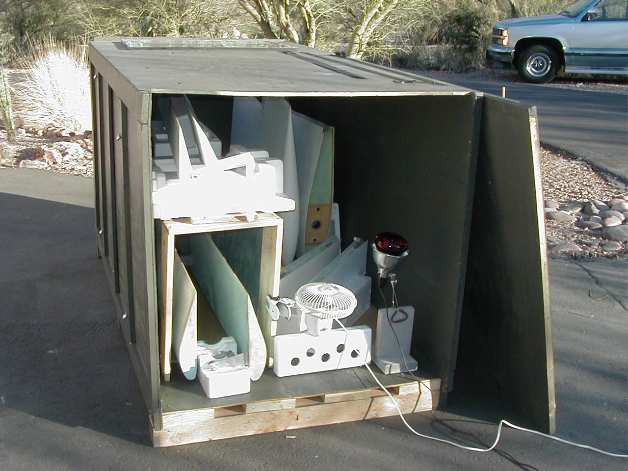 A question about post curing our epoxy parts. Â Today we built ourselves an "oven" for baking our parts at the appropriate 40-50 degree celsius for post cure. Â We built a 16' X 4' X 4' enclosure out of foil claded 4X8 sheets of insulation foam. Â The box is backed up to a basement brick fireplace (no open flames) in which I would like to place a suitable heating element. Â I also have use of an attic fan to low air around the cavity.Â